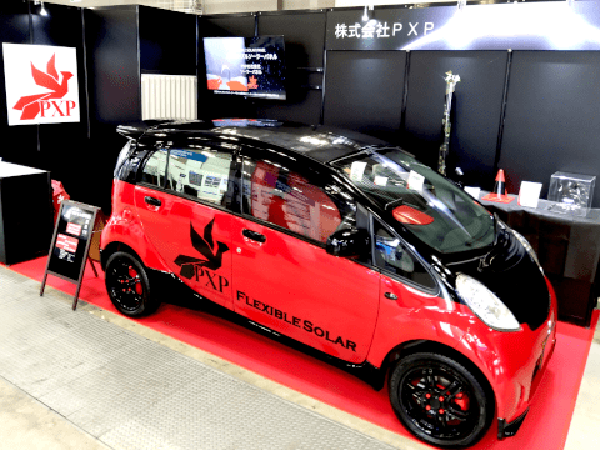 軽くて曲がる、割れないソーラーを貼り付けた実証EVを展示会に展示